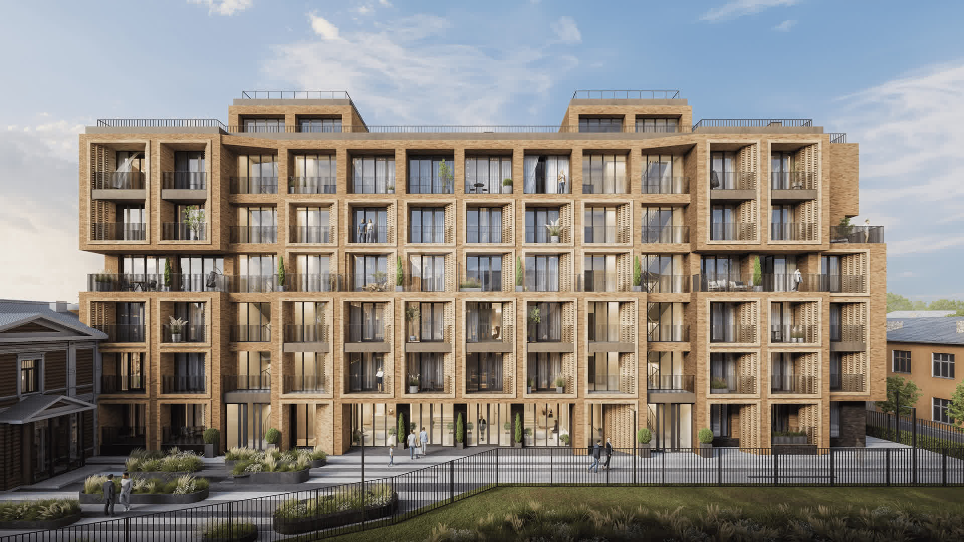 В этом доме всегда будет много света и воздуха. Панорамные витражные окна наполняют пространство естественным сиянием, а мягкие бежевые оттенки кирпичной кладки отражают солнечные лучи, добавляя контурам здания совершенства.